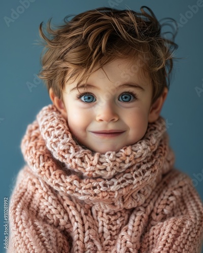 Smiling blue-eyed child in cozy light knitted sweater with large scarf on blue background