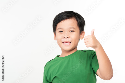 Smiling boy in white t-shirt showing thumb up on a light background