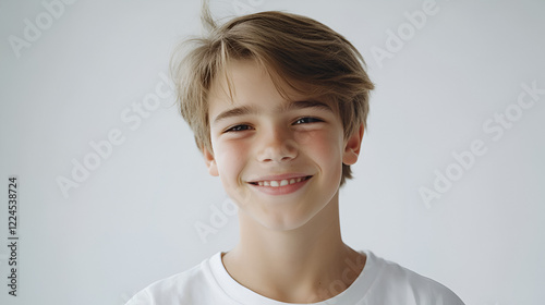 Smiling Boy Portrait: A cheerful portrait of a young boy with a warm, genuine smile, his blond hair tousled, radiating happiness and youthful energy.