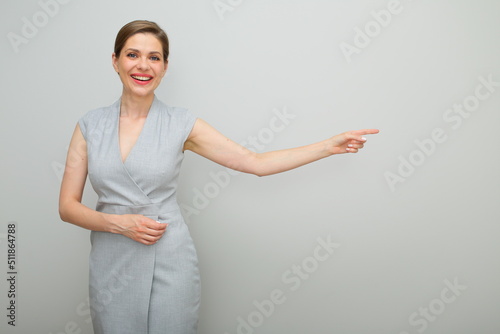 Smiling business woman with short hairstyle pointing finger to copy space, isolated female studio portrait, young business lady in gray dress.