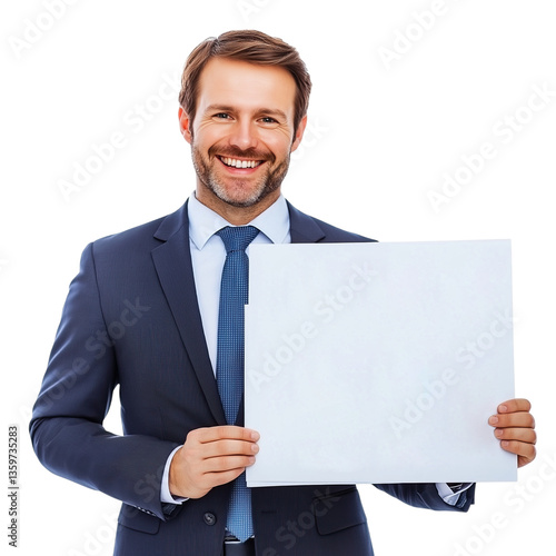 smiling businessman in suit holds blank white sign ready for message isolated on png transparent background