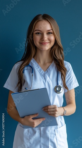 Smiling Caucasian Female Doctor Holding a Clipboard, Professional Healthcare Provider, Solid Turquoise Background