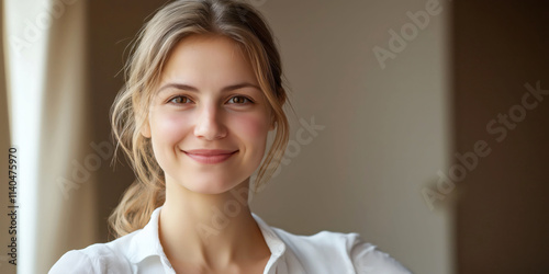 Smiling caucasian female young adult in white shirt in bright room