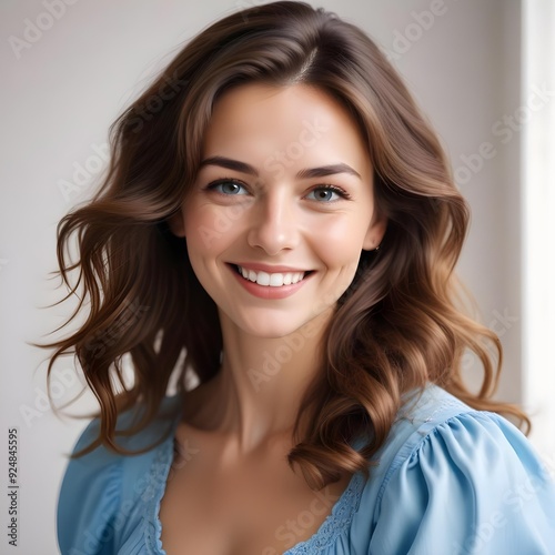 Smiling Caucasian woman with long brown hair, wearing a blue dress, isolated on a white background