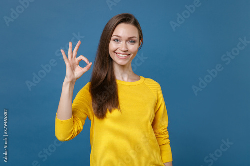 Smiling cheerful attractive beautiful young brunette woman 20s wearing yellow casual clothes posing standing showing OK gesture looking camera isolated on blue color wall background, studio portrait.
