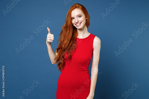 Smiling cheerful beautiful attractive young redhead woman 20s wearing bright red elegant evening dress standing showing thumb up looking camera isolated on blue color wall background studio portrait.