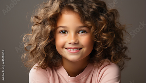 Smiling child, cute portrait, curly hair, cheerful girl looking generated by AI