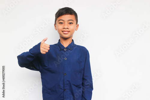 Smiling confident boy wearing a blue casual shirt looking at the camera with showing thumb up isolated on white background
