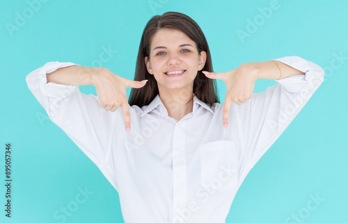 Smiling confident girl pointing fingers down to show advertisement, showing promo offer on bottom empty space, standing against blue background.