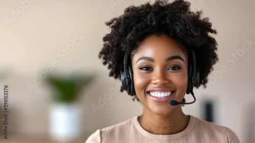 Smiling customer service agent wearing headset, providing assistance with friendly demeanor. Bright and welcoming atmosphere enhances experience