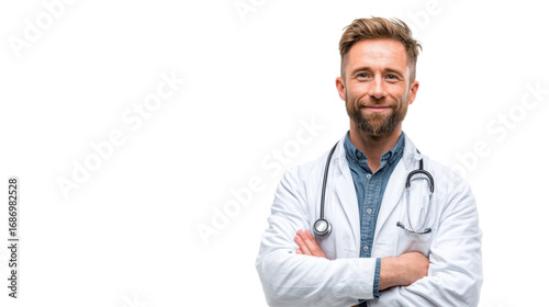Smiling doctor in a white coat, arms crossed, isolated on a white background.