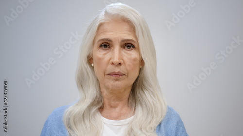 Smiling elderly woman flirting inside. Happy lady pointing to camera indoors.