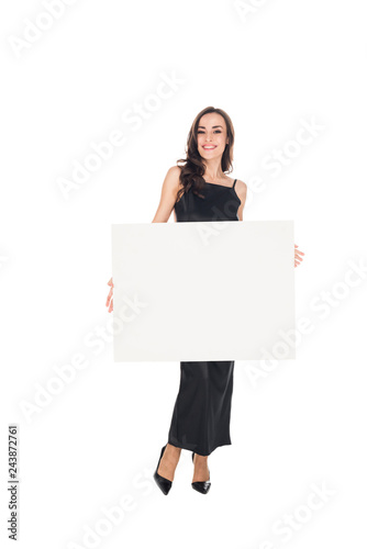 smiling elegant woman in black dress posing with empty board isolated on white