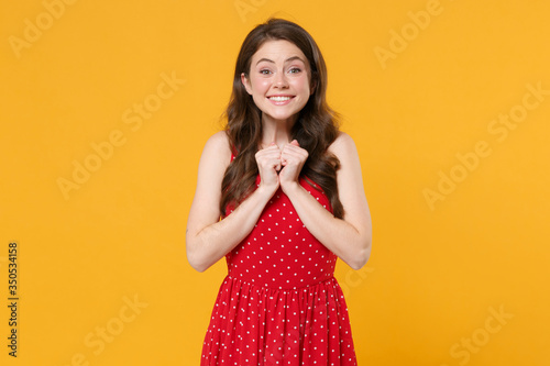 Smiling excited young brunette woman girl in red summer dress posing isolated on yellow background. People lifestyle concept. Mock up copy space. Clenching fists, wait for special moment, making wish.