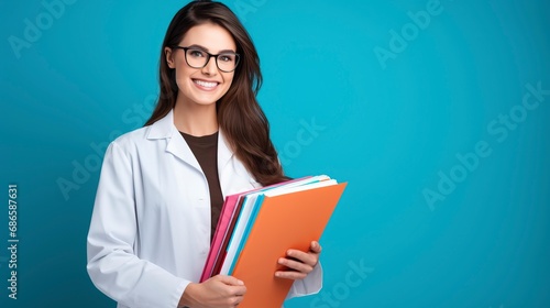Smiling female doctor holding medical records, one Color background , copy space made by generative ai