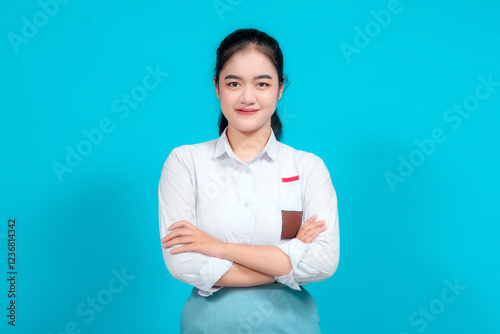 Smiling female student dressed in a uniform, and posing confidently on a vibrant blue backdrop.