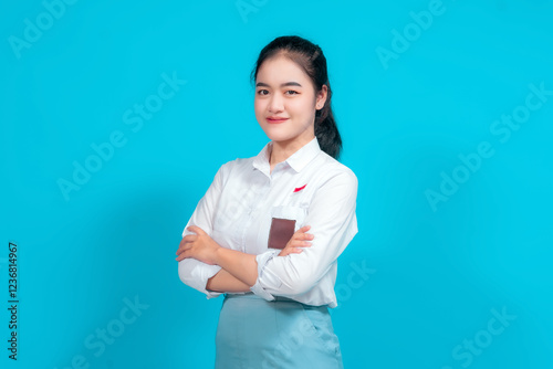 Smiling female student dressed in a uniform, and posing confidently on a vibrant blue backdrop.