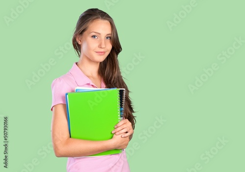 Smiling female student with backpack and textbooks