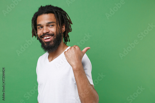 Smiling funny young african american man guy with dreadlocks 20s wearing white casual t-shirt posing pointing thumb aside on mock up copy space isolated on green color wall background studio portrait.