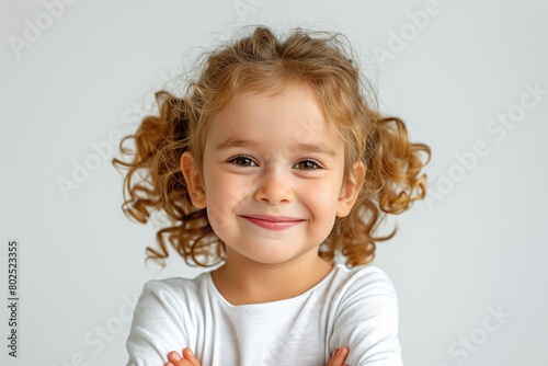Smiling Girl Happy Portrait of a Children, White Background Studio Photo of Cheerful People Showing Emotion, Female Child Hair Fashion Clothing Model