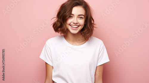 Smiling girl in white t-shirt on pink background mockup. Beautiful happy woman model looking at camera