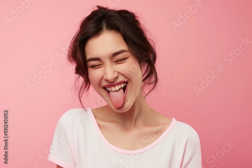 Smiling girl winks at the camera with tongue out in a playful pose. Pink background highlights her happiness and cheerful expression. Young adult caucasian woman shows a casual carefree attitude.