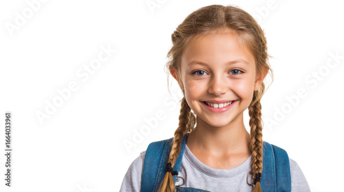Smiling girl with braided hair, wearing a shirt and denim overalls, isolated on a white background.