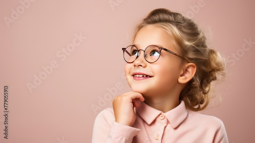 Smiling girl with glasses looking up and thinking