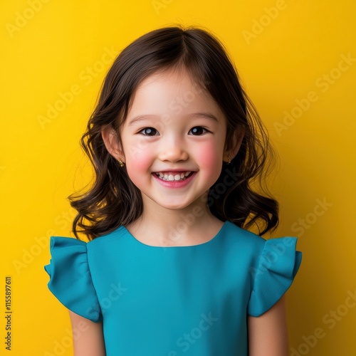 Smiling Girl with Long Hair and Blue Dress on Yellow Background