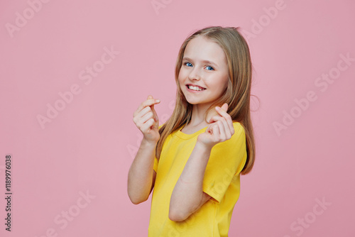 Smiling girl with long hair in a yellow shirt making heart shapes on a pink background, expressing joy and positivity, ideal for family and lifestyle themes