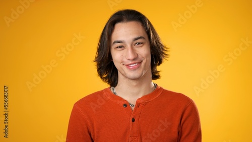 Smiling handsome Hispanic young man 20s wearing orange casual shirt isolated on yellow color background in studio. Portrait of gender fluid male sincere emotions lifestyle concept. Looking camera
