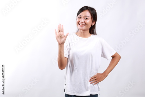 Smiling happy good-looking asian girl giving advice, showing five fingers as explain rules, make point, standing white background