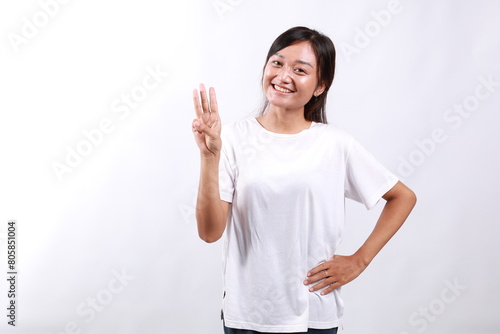 Smiling happy good-looking asian girl giving advice, showing three fingers as explain rules, make point, standing white background