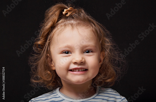 Smiling happy small kid girl looking up and decided the question on black studio background. Closeup emotional