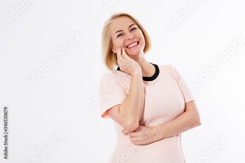 Smiling happy woman isolated ob white background, friendly face life style concept, middle-aged female posing over white