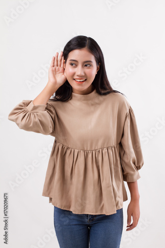 smiling happy woman listening ear to good news
