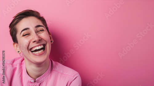 Smiling happy woman on pink background