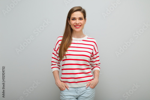 Smiling happy woman standing with hands in pockets, isolated female studio portrait, girl in white sweater with red stripes..