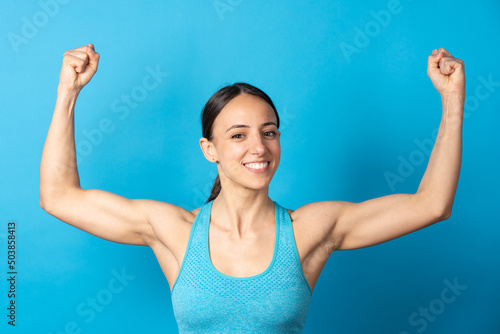 Smiling hispanic sportswoman showing biceps and looking at camera isolated on blue background.