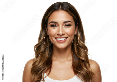 Smiling Hispanic Woman with Long Hair and Hoop Earrings in Front of a Black Background, Exuding Joy and Confidence