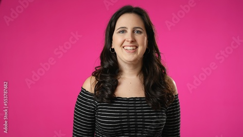 Smiling laughing beautiful brunette young woman 20s 30s years old posing isolated on pink background studio. People sincere emotions lifestyle concept. Looking at camera with charming smile
