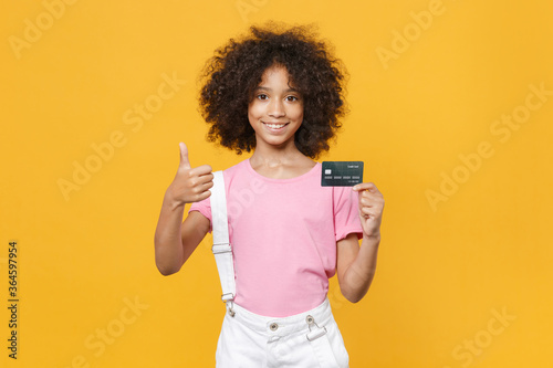 Smiling little african american kid girl 12-13 years old in pink t-shirt isolated on yellow wall background. Childhood lifestyle concept. Mock up copy space. Hold credit bank card showing thumb up.