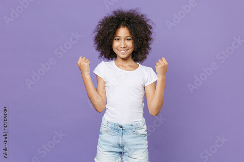 Smiling little african american kid girl 12-13 years old in white t-shirt isolated on pastel violet background studio portrait. Childhood lifestyle concept. Mock up copy space. Doing winner gesture.