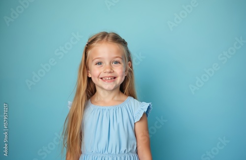 Smiling little girl in blue dress stands against blue background. Blonde hair, blue eyes. Copy space for text or design elements. Cute toddler portrait, pure innocence, childhood joy, pastel colors.