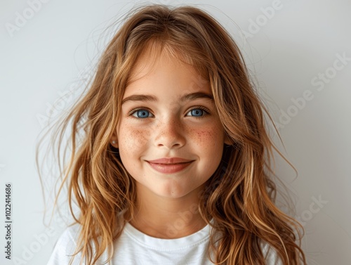 smiling little girl with wavy hair in white t-shirt happy kid dental ad children young cute teen portrait isolated white background closeup