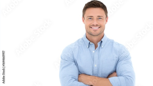 Smiling male professional in fitted blue shirt, casual business style, arms folded, relaxed pose, isolated on white background, ideal for leadership and business profile visuals