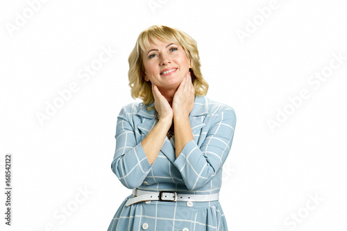 Smiling mature woman looking upwards. Portrait of cheerful white-skin elegant lady isolated on white background.