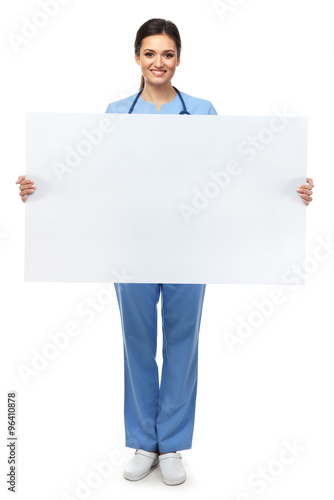 Smiling medical doctor holding a screen isolated on white
