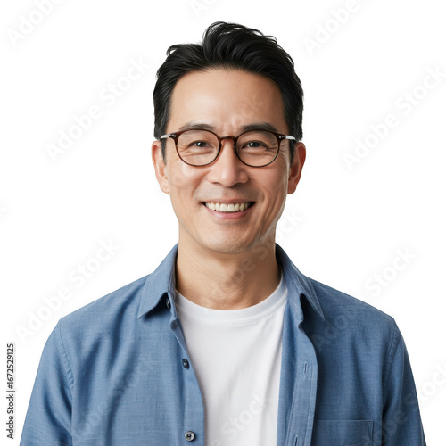 Smiling middle aged asian man wearing glasses and a blue button down shirt over a white t shirt isolated on transparent background