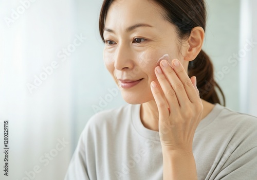 Smiling middle-aged asian woman gently applying moisturizer on her face, taking care of her skin with a daily skincare routine